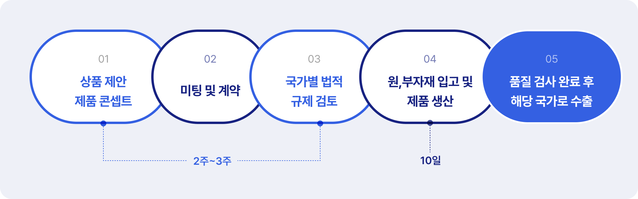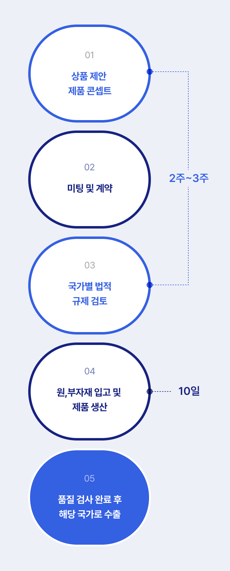 상품 기획, 제품 개발, 법적 규제 검토, 출하까지 전 과정에 대한 서비스를 제공합니다.
